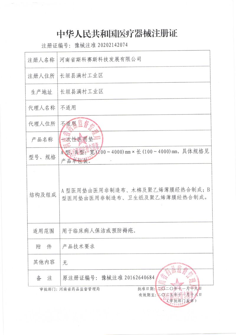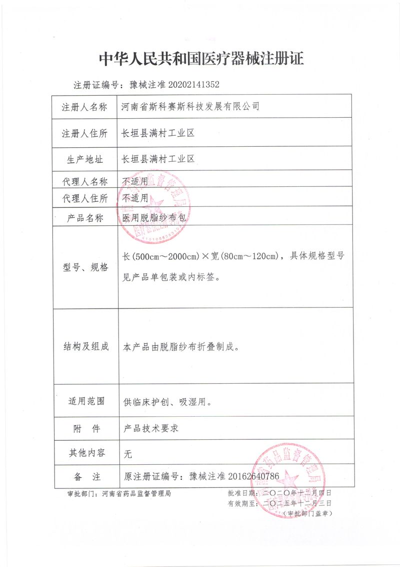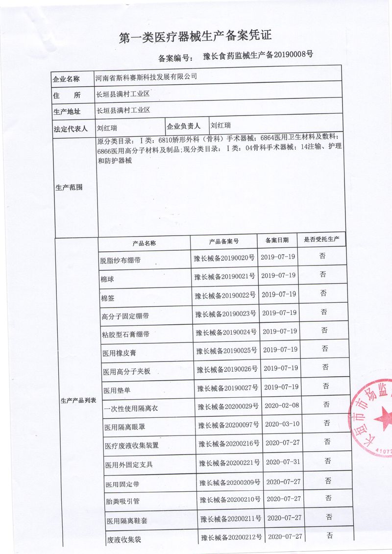 河南省斯科賽斯科技發(fā)展有限公司創(chuàng)建于 2011 年,位于“中國醫(yī)療耗材之都”- 河南省長垣縣,西臨 308 省道,南靠新菏鐵路,北依長濟高速,交通便捷,經(jīng)濟發(fā)達(dá),環(huán)境優(yōu)美。斯科賽斯積極進(jìn)入醫(yī)療健康和服務(wù)領(lǐng)域,秉承為用戶創(chuàng)造價值的理念,專注于醫(yī)用耗材解決方案的研發(fā)和運營,并為用戶提供完善的產(chǎn)品解決方案;  斯科賽斯主要生產(chǎn)醫(yī)用麻醉系列、醫(yī)用高分子系列、醫(yī)用敷料包系列、醫(yī)用無紡布系列、醫(yī)用防護系列、醫(yī)用脫脂棉系列、生物材料制品類等七大類、100 多個品種、400 多個規(guī)格的產(chǎn)品。公司占地面積約 30000 平方米,建筑面積20000 平方米,擁有 10 萬級的凈化車間總面積 10000 平方米。擁有國際先進(jìn)水平的生產(chǎn)設(shè)備和檢測儀器,技術(shù)裝備精良,檢測手段完善,為醫(yī)療行業(yè)的不斷發(fā)展進(jìn)步提供保障。公司順利通過 ISO9001、ISO13485 質(zhì)量管理體系認(rèn)證。  斯科賽斯堅持研發(fā)高科技新產(chǎn)品,力爭在醫(yī)療器械關(guān)鍵領(lǐng)域取得技術(shù)和研發(fā)的重大突破;立足國內(nèi)和國際兩個市場,逐步實現(xiàn)管理理念、經(jīng)營機制、人力資源、技術(shù)、產(chǎn)品、市場等全方位對接,提高企業(yè)的核心競爭力;過去的歲月里,斯科賽斯砥礪前行,誠信務(wù)實,銳意進(jìn)取,不斷創(chuàng)新,用自己的睿智和辛勞,以富有責(zé)任感的使命,在探索中追求,在追求中超越,致力于成為值得信賴的醫(yī)療用品生產(chǎn)企業(yè)!在未來的日子里,斯科賽斯將一如既往豪情滿懷,信心百倍,攜手并肩,執(zhí)著追求,向更高的的目標(biāo)前進(jìn),鑄造新的輝煌!